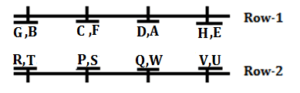 Sixteen persons are sitting in two parallel rows containing four sofas in each row in such a way that there is an equal distance between adjacent sofas. In the first row, eight persons i.e. A, B, C, D, E, F, G and H are seated and all of them are facing south. In the second row, eight persons i.e. P, Q, R, S, T, U, V and W are seated and all of them are facing north. Therefore, in the given seating arrangement, each person seated in a row faces another person of the other row. Two persons sit on each sofa.