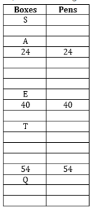 कुछ निश्चित संख्या में बॉक्स एक के ऊपर एक करके रखे गये हैं। प्रत्येक बॉक्स में पेन की संख्या भिन्न है। चार बॉक्स A और E के बीच रखे हैं। तीन से अधिक बॉक्स A के ऊपर नहीं रखे गये हैं। E और जिस बॉक्स में 24 पेन हैं, जो E के ऊपर रखा गया है उनके मध्य तीन बॉक्स रखे हैं। बॉक्स S को सबसे ऊपरी स्थान पर रखा गया है। बॉक्स A और जिस बॉक्स में 40 पेन है, उनके मध्य रखे बॉक्स की संख्या, बॉक्स E के नीचे रखे गये बॉक्स की संख्या से आधी है। 24 पेन वाले बॉक्स और जिस बॉक्स में इससे 16 पेन अधिक हैं उनके मध्य चार बॉक्स रखे हैं। बॉक्स E और T के बीच रखे गये बॉक्स की संख्या, T और 54 पेन वाले बॉक्स के मध्य रखे गये बॉक्स की संख्या से एक कम हैं। बॉक्स Q को सबसे निचले स्थान से तीसरे स्थान पर रखा गया है। जिस बॉक्स में 54 पेन हैं, वह Q के ठीक ऊपर रखा गया है। T और Q के बीच रखे बॉक्स की संख्या, S और A के बीच रखे गये बॉक्स की तुलना में चार गुना है।