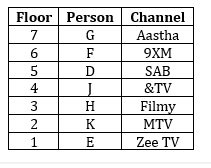 सात व्यक्ति D, E, F, G, H, J और K सात मंजिला इमारत में रहते हैं लेकिन जरूरी नहीं कि वे समान क्रम में हों। सबसे निचले तल की संख्या 1 है और उससे ऊपर वाले तल की संख्या 2 है और इसी तरह शीर्षतल की संख्या 7 है। उनमें से प्रत्येक व्यक्ति अलग-अलग टीवी चैनल देखता है अर्थात् MTV, 9XM, SAB, Zee TV, & TV, Filmy और Aastha, लेकिन जरूरी नहीं कि समान क्रम में हो।