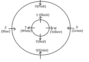 S, उस व्यक्ति के ठीक दायीं ओर बैठा है, जो T की ओर उन्मुख है, जो लाल रंग पसंद करने वाले व्यक्ति के निकट बैठा है। हरा और नीला रंग पसंद करने वाले व्यक्ति U के निकटतम पड़ोसी हैं, जो काला रंग पसंद करने वाले व्यक्ति की ओर उन्मुख है। U न तो S न ही T के निकट बैठा है। V, W के ठीक दायीं ओर बैठा है, जो हरा रंग पसंद करने वाले व्यक्ति की ओर उन्मुख है। बैंगनी रंग पसंद करने वाला व्यक्ति X के ठीक बायीं ओर बैठा है, जो बाहर की ओर उन्मुख नहीं है। गुलाबी रंग पसंद करने वाला व्यक्ति Y की ओर उन्मुख है जो अंदर की ओर उन्मुख नहीं है। Z सफेद रंग पसंद करने वाले व्यक्ति की ओर उन्मुख है। पीला रंग पसंद करने वाला व्यक्ति बाहर की ओर उन्मुख है।