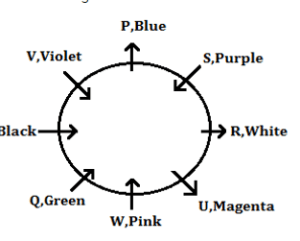 आठ व्यक्ति एक वृत्ताकार मेज के चारों ओर बैठे हैं और उनमें से प्रत्येक को अलग-अलग रंग पसंद हैं। उनमें से कुछ केंद्र की ओर उन्मुख हैं जबकि कुछ केंद्र से बाहर की ओर उन्मुख हैं। W को गुलाबी रंग पसंद है और वह नीला रंग पसंद करने वाले व्यक्ति की ओर उन्मुख है। W और सफ़ेद रंग पसंद करने वाले व्यक्ति के बीच एक व्यक्ति बैठा है। U, W का एक निकटतम पड़ोसी है। Q उस व्यक्ति के पास नहीं बैठा है जिसे सफ़ेद रंग पसंद है। Q, U के दायीं ओर से दूसरे स्थान पर बैठा है। Q और S एक-दूसरे की ओर उन्मुख हैं। U और W दोनों एक दूसरे की विपरीत दिशा की ओर उन्मुख हैं। तीन व्यक्ति R और काला रंग पसंद करने वाले व्यक्ति के बीच में बैठे हैं। V बैंगनी रंग पसंद करता है और मैजेंटा पसंद करने वाले व्यक्ति के विपरीत बैठा है। P और T के बीच एक व्यक्ति बैठा है, जो हरा रंग पसंद करने वाले व्यक्ति के ठीक बाएं बैठा है। जामुनी रंग पसंद करने वाला व्यक्ति, P और R के संबंध में विपरीत दिशा की ओर उन्मुख है। V और T दोनों एक ही दिशा में उन्मुख हैं। T नीला रंग पसंद नहीं करता है। काला रंग पसंद करने वाला व्यक्ति, सफेद रंग पसंद करने वाले व्यक्ति के सन्दर्भ में विपरीत दिशा की ओर उन्मुख है।