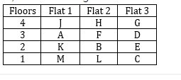 L, M के पूर्व में रहता है। F जो सम संख्या तल पर नहीं रहता है, वह L के उत्तर में रहता है। B, M के उत्तर-पूर्व में साथ ही D के दक्षिण -पश्चिम में रहता है। J, H के पश्चिम में रहता है। G और K जो F के पश्चिम में नहीं रहता है उनके मध्य एक तल का अंतराल है। A, E के ऊपर रहता है जो B के पूर्व में रहता है। K, C के ऊपर और A के नीचे रहता है जो J के दक्षिण में रहता है। G एक सम संख्या वाले फ्लैट में नहीं रहता है।