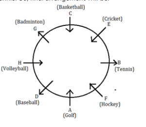 आठ व्यक्ति अर्थात् A, B, C, D, E, F, G और H एक वृत्ताकार मेज़ के चारों ओर बैठे हैं लेकिन जरूरी नहीं कि वे समान क्रम में हों। उनमें से कुछ केंद्र की ओर मुख किए हुए हैं और शेष केंद्र से बाहर की ओर उन्मुख हैं। प्रत्येक व्यक्ति को अलग-अलग खेल अर्थात् क्रिकेट, बेसबॉल, टेनिस, बास्केटबॉल, वॉलीबॉल, गोल्फ, हॉकी और बैडमिंटन पसंद हैं लेकिन जरूरी नहीं कि समान क्रम में हो। क्रमागत दो से अधिक व्यक्ति एक ही दिशा की ओर उन्मुख नहीं हैं।