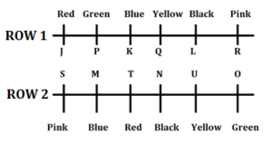 बारह व्यक्ति अर्थात: J, K, L, M, N, O, P, Q, R, S, T और U दो समानांतर पंक्तियों अर्थात- पंक्ति 1 और पंक्ति 2 में बैठे हैं। 6 व्यक्ति पंक्ति 1 में बैठे हुए हैं जिनका मुख दक्षिण दिशा की ओर है जबकि शेष व्यक्ति पंक्ति 2 में बैठे हुए हैं जिनका मुख उत्तर दिशा की ओर है। प्रत्येक पंक्ति में बैठे व्यक्तियों को अलग-अलंग रंग पसंद है, अर्थात- लाल, नीला, हरा, गुलाबी, पीला और काला। समान पंक्ति में बैठे व्यक्ति या एक-दूसरे की ओर उन्मुख व्यक्ति समान रंग पसंद नहीं करते हैं।