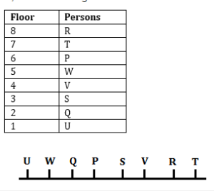 आठ व्यक्ति P, Q , R, S, T, U, V और W एक आठ मंजिला इमारत में रहते हैं, लेकिन आवश्यक नहीं कि समान क्रम में हो। सबसे निचली मंजिल को संख्या 1 के रूप में गिना जाता है, इससे ठीक ऊपरी मंजिल को संख्या 2 के रूप में गिना जाता है और इस प्रकार सबसे ऊपरी मंजिल को संख्या 8 के रूप में गिना जाता है। साथ ही, वे एक पंक्ति में बैठे हैं तथा उत्तर दिशा की ओर उन्मुख हैं, पुनः आवश्यक नहीं कि समान क्रम में हो।