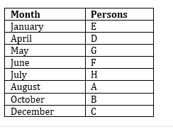 आठ व्यक्ति A, B, C, D, E, F, G और H विभिन्न महीनों अर्थात् जनवरी, अप्रैल, मई, जून, जुलाई, अगस्त, अक्टूबर और दिसंबर में फिल्म देखने जा रहे हैं, लेकिन आवश्यक नहीं कि समान क्रम में हो।