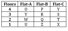 R is to the north of Q and west of S. No-one sits to the east of S. O sits to the north-west of S but not north of R. Q lives on second floor. T lives to the south-east of O. T doesn’t live in Flat-B. U lives to the south-west of T but doesn’t live in the same flat in which R lives. P lives three floors above Z’s floor and both live in same flat but not in Flat-C. V lives to the north-west of T but not east of R. Y lives to the north of X.