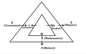 एक समबाहु त्रिभुजाकर मेज को एक अन्य खोखले समबाहु त्रिभुजाकार मेज के अंदर इस प्रकार रखा जाता है, कि तीन व्यक्ति अर्थात A, B और C, आंतरिक मेज की प्रत्येक भुजा के मध्य बैठे हैं और अन्य तीन व्यक्ति अर्थात P, Q और R बाहरी मेज की प्रत्येक भुजा के मध्य में बैठे हैं। आंतरिक समबाहु त्रिभुजाकार मेज के चारो ओर बैठे व्यक्ति, बाहरी समबाहु त्रिभुजाकार मेज के चारो ओर बैठे व्यक्तियों के ठीक विपरीत बैठे हैं। मेज के कोने पर कोई भी नहीं बैठा है। वे सभी अलग-अलग विषय पसंद करते हैं अर्थात् रसायन विज्ञान, अंग्रेजी, गणित, अर्थशास्त्र, इतिहास और भौतिकी को पसंद करते हैं। सभी जानकारी आवश्यक नहीं कि समान क्रम में हो।