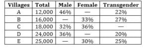 Table given below shows population of five villages and percentage of male, female and transgenders among them.