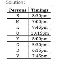 आठ व्यक्ति B, M, K, O, Y, G, D, V एक दिन में भिन्न समय पर फिल्म देखने जाते हैं, अर्थात- 5:30 बजे, 6:15 बजे, 7:00 बजे, 7:45 बजे, 8:00 बजे, 8:30 बजे, 9:45 बजे और 10:15 बजे| दो व्यक्ति V और K के मध्य फिल्म देखते हैं, जो 9:45 बजे फिल्म देखता है। M और Y के फिल्म देखने के समय में 1 घंटे का अंतर है। G और D के मध्य कोई फिल्म नहीं देखता है। B, O से पहले फिल्म देखता है। G और Y के फिल्म देखने के समय में ढ़ाई घंटे का अंतर है।