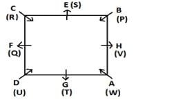 आठ व्यक्ति A, B, C, D, E, F, G, H एक वर्गाकार मेज के चारों ओर बैठे हैं। उनमें से चार कोनों पर बैठे हैं और केंद्र की ओर उन्मुख हैं तथा शेष मेज की भुजाओं पर बैठे हैं और केंद्र से बाहर की ओर उन्मुख हैं। वे अलग-अलग कार्यालय में कार्य करते हैं अर्थात्: P, Q, R, S, T, U, V, W लेकिन जरूरी नहीं कि समान क्रम में हो। C, G के दायें से तीसरे स्थान पर बैठा है, जो T में कार्य करता है। Q में कार्य करने वाला व्यक्ति, W में कार्य करने वाले व्यक्ति के निकट नहीं बैठा है और केंद्र की ओर उन्मुख नहीं है। R और W में कार्य करने वाले व्यक्ति एक दूसरे के विपरीत बैठे हैं लेकिन F दोनों से सम्बन्धित नहीं है। E, S में कार्य करता है। C और H के बीच में दो व्यक्ति बैठे हैं। P और V में कार्य करने वाले व्यक्ति एक दूसरे से ठीक बायें हैं। D, U में कार्य करता है और A के बायें से दूसरे स्थान पर है, जो G के निकट है। H, E के निकट नहीं बैठा है और P में कार्य नहीं करता है। F, H के विपरीत बैठा है।